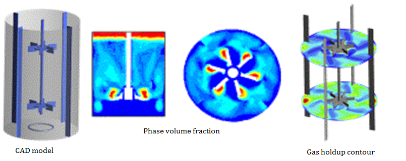 Now we will see in detail bubble column reactors. These are the equipments used in chemical industry for gas-liquid reactions. They are built of vertical columns of cylindrical forms. Gas is introduced at the bottom of column which causes turbulent stream  and thus provide required stirring action for reactive gas exchange. The CFD modeling of this is predominantly done, an example is as shown in the figure below, with 2 phases as gas & liquid.